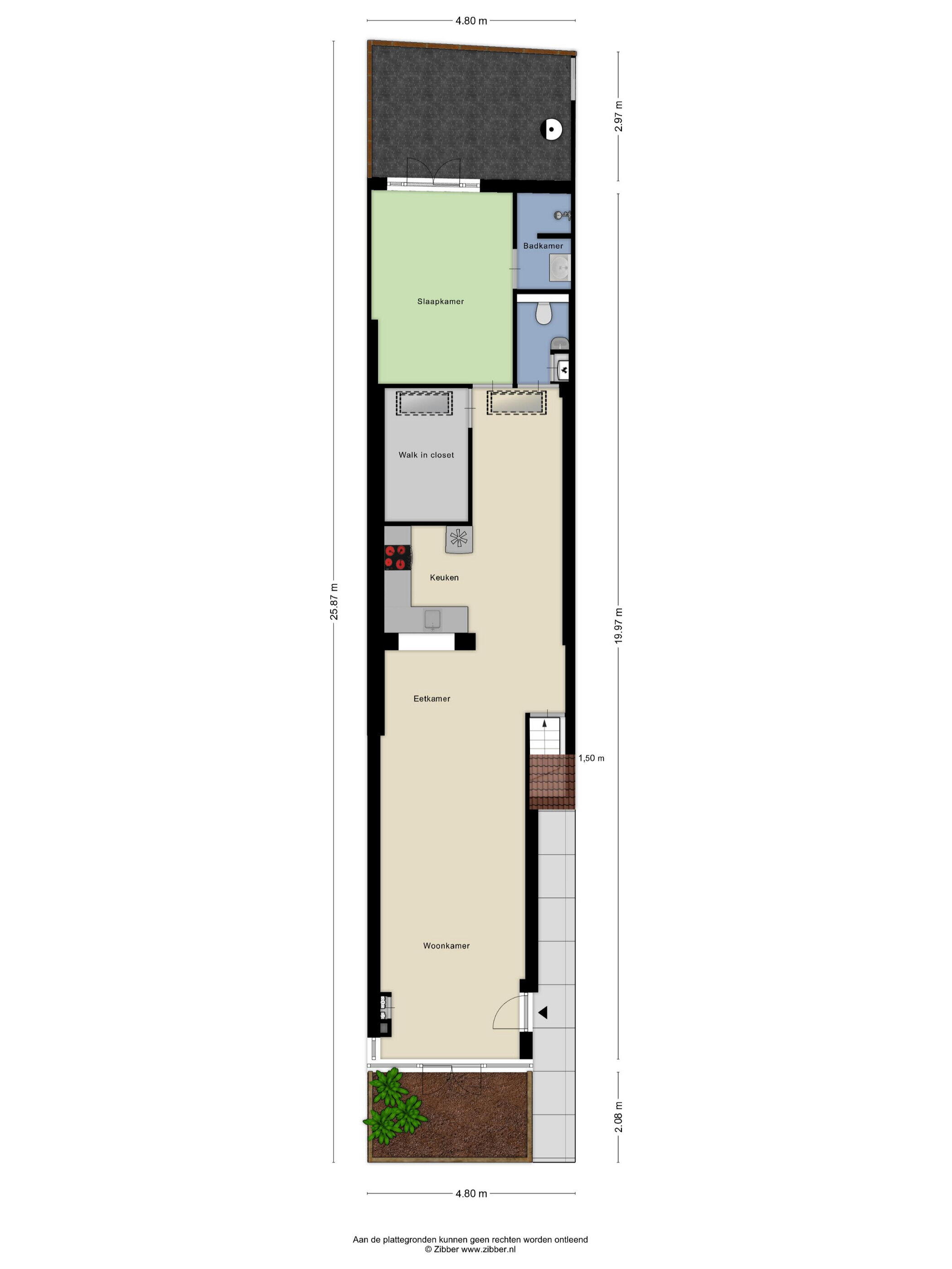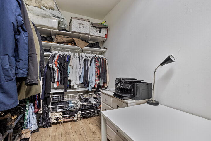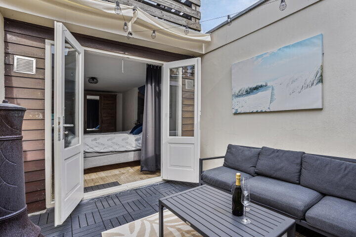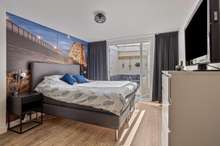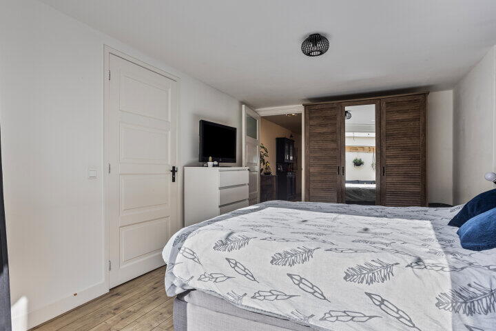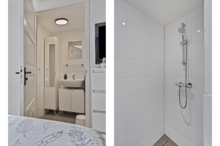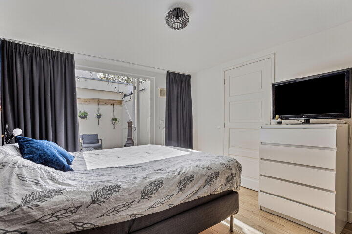 De slaapkamer ligt aan de rustige achterzijde en beschikt over openslaande deuren naar de patio. Vanuit hier is de badkamer bereikbaar, voorzien van een inloopdouche en wastafel. De tweede kamer is nu een walk-in closet, maar kan ook worden gebruikt als werkkamer. Door het realiseren van een groter raam kan dit eenvoudig worden omgetoverd tot een volwaardige slaapkamer.