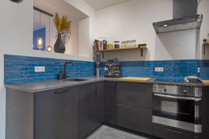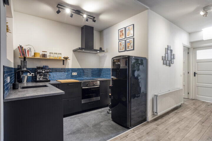 De open keuken is in 2021 vernieuwd en uitgevoerd in zwart met een kunststof werkblad en opvallende blauwe tegels achterwand. Voorzien van een vaatwasser, oven, 4-pits inductiekookplaat, afzuigkap en koel-/vriescombinatie. De keuken fungeert tevens als stijlvolle ruimtedeler tussen woon- en slaapgedeelte.